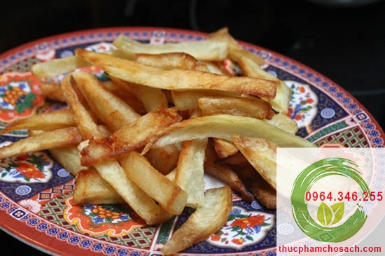 Bước 4: Khoai tây gọt vỏ, thái từng lát nhỏ, ngâm khoai vào nước lạnh có pha chút muối và vài viên đá lạnh. Ngâm chừng 30 phút vớt ra để ráo, đem chiên đến khi khoai vàng.