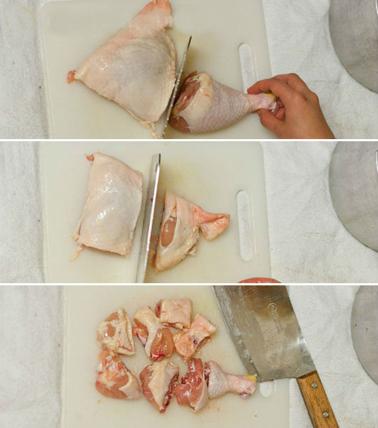Bước 1: Gà mua về đem sát muối rồi rửa sạch rồi lọc bỏ bớt phần mỡ ở miếng thịt gà, sau đó chặt gà thành miếng nhỏ vừa ăn. Trước khi chặt gà nên để ga vào tủ lạnh 1 lúc để miếng gà hơi cứng thì chặt miếng gà sẽ không bị nát và đẹp hơn. Hoặc bạn có thể rút bỏ xương để ninh lấy nước và chỉ lấy thịt để nấu thịt đông cũng được.