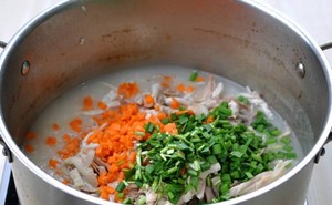 Bước 5: Rồi sau đó bạn cho cà rốt thái nhỏ và hành lá vào nồi, nấu đến khi cà rốt chín là được.
