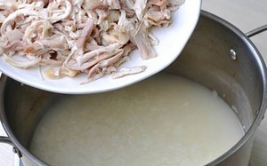 Bước 4: Kiểm tra nồi cháo khi các hạt gạo nở bung, cháo sánh lại thì cho thịt gà xé nhỏ vào nồi và nêm nếm cho gia vị vào cho vừa ăn.