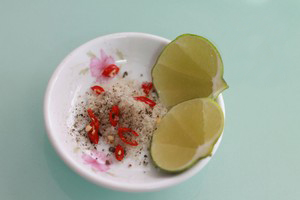 Giờ bạn chỉ việc bày gà ra đĩa, cài vào mỏ gà 1 bông hồng, thêm 1 đĩa muối, chanh ớt và 1 ít lá chanh thái chỉ.