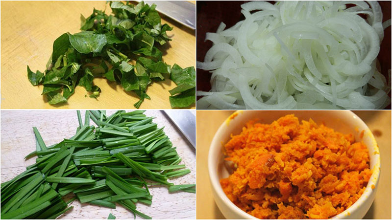 - Tỏi băm nhuyễn. Hành tây lột vỏ, bào mỏng. Hẹ lá rửa sạch, cắt khúc dài khoảng 3 cm.