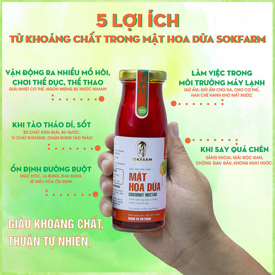 - Mật hoa dừa Sokfarm cũng đã được nghiên cứu và chứng nhận là sản phẩm giàu chất chống oxi hóa PORIFOS (Polyphenol Rich Foods) có tác dụng ôn định huyết áp, giúp hệ tim mạch hoạt động ổn định, chống xơ vữa động mạch, giảm nguy cơ mắc bệnh tiểu đường tuýp 2, tăng cường cho não bộ hoạt động tốt, phòng chống ung thư.