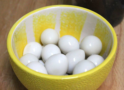 Trứng cút bạn luộc nhỏ lửa và đun trong 8 - 14 phút. Sau đó, bóc vỏ. Đem trứng rán qua cho vàng vỏ.