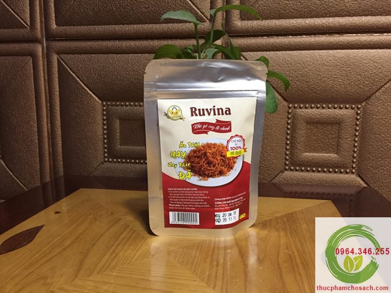 Chợ sạch đã hợp tác với công ty thực phẩm Ruvina để phân phối sản phẩm Khô gà lá chanh - một món ăn vặt nhẹ nhàng ở Hà Nội cũng như trên toàn quốc. Giá: 20k/túi
